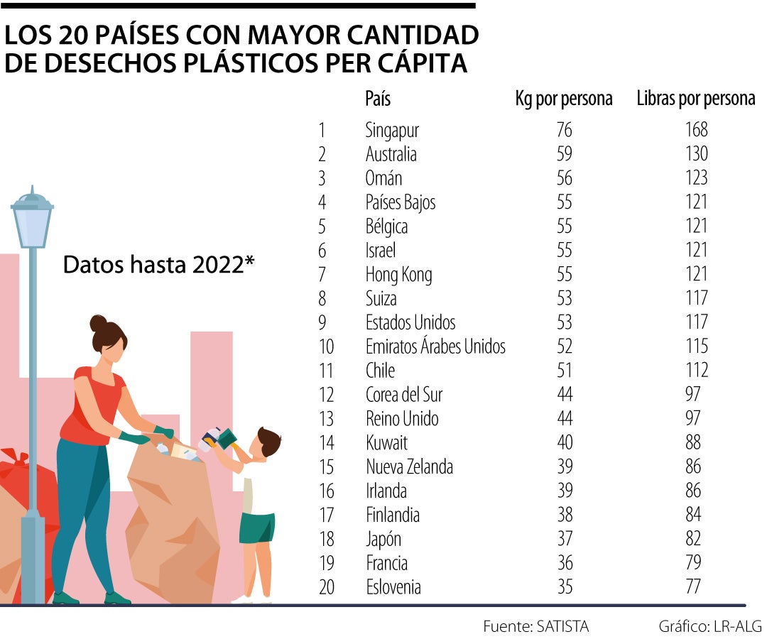 El primer país en la lista se trata de Singapur, pues en este el consumo per cápita de plástico fue de 76 kilogramos. En el segundo lugar estuvo Australia con 59 kg y el último lugar del podio fue para Omán, cuyo consumo de plástico por persona alcanzó los 56kg.