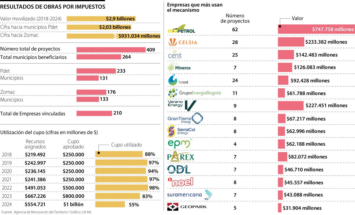 Ecopetrol y Celsia son, hasta ahora, las dos compañías que más usaron el mecanismo de Obras por Impuestos, pero la lista de contribuyentes destacadas es larga y, por ejemplo, al descontar a Cenit y Hocol, aparece Verano Energy, con una bolsa de nueve proyectos y recursos por $227.451 millones.