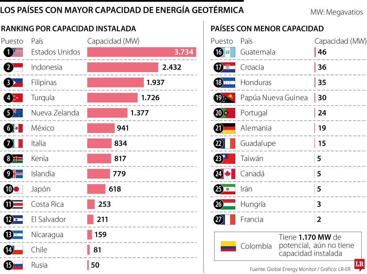 De acuerdo con datos recopilados por Global Energy Monitor, varios países ya han desarrollado esta tecnología a gran escala. El líder mundial es Estados Unidos, que cuenta con cerca de 3.734 megavatios de capacidad geotérmica instalada. Esto lo deja con una ventaja amplia frente a otros países que también han apostado por este tipo de energía.