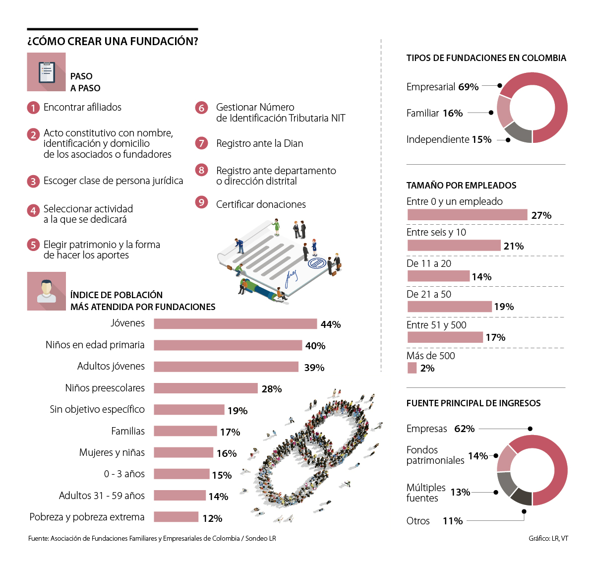 Las fundaciones están incluidas en el grupo conocido como “entidades sin ánimo de lucro” (Esal) que, de acuerdo con la Cámara de Comercio de Bogotá (CCB), “son personas jurídicas que se constituyen por la voluntad de asociación o creación de otras personas (naturales o jurídicas) para realizar actividades en beneficio de los asociados, de terceras personas o de la comunidad en general y no persiguen el reparto de utilidades entre sus miembros”.