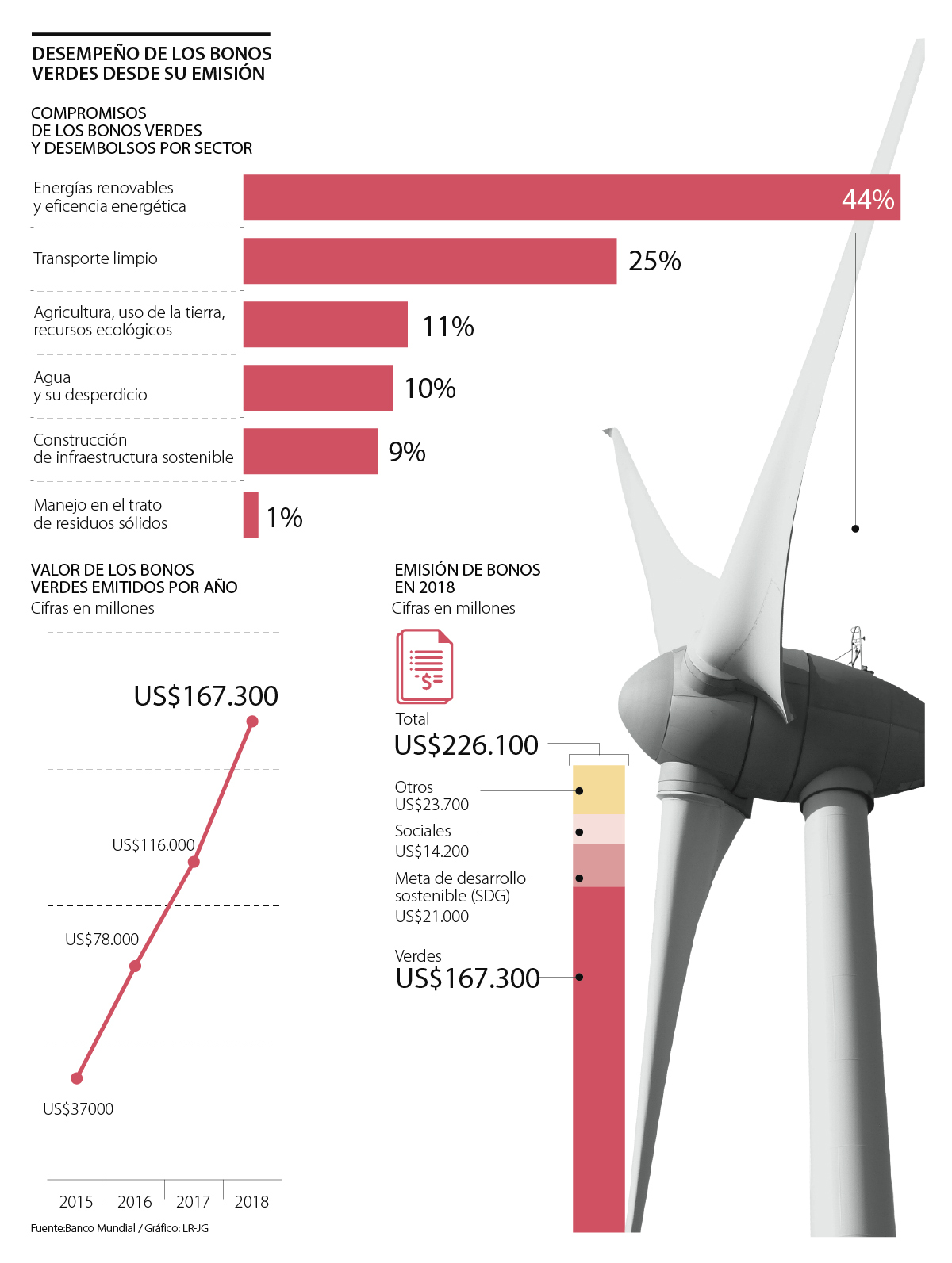 De acuerdo con los últimos reportes, los sectores sostenibles que más desembolsos han tenido con este tipo de financiamiento son Energías renovables y eficiencia energética (44%), transporte público (25%) y Agricultura, uso de la tierra, recursos ecológicos (11%).