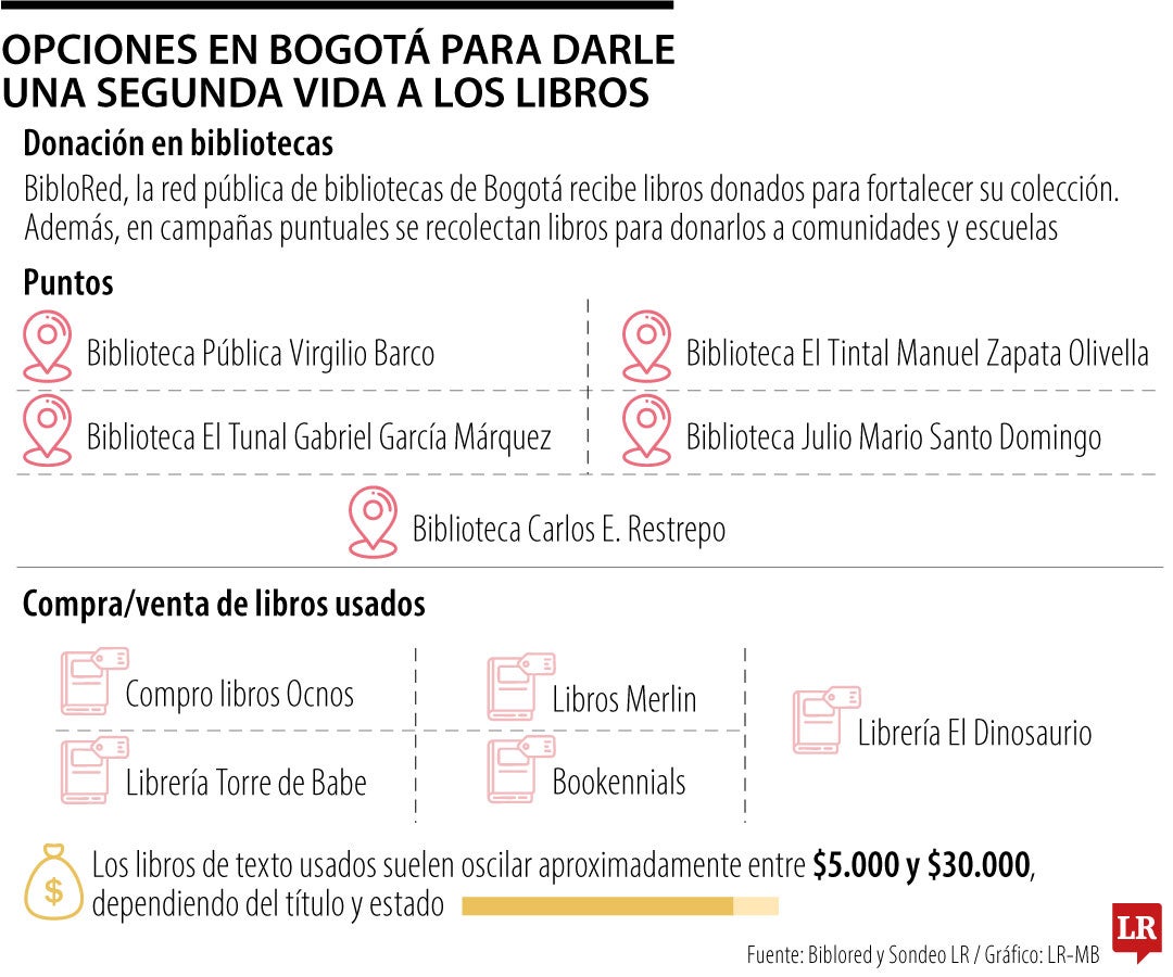 Pero cada año se demandan o se desean nuevos textos y, a no ser que cuente con amplias bibliotecas, es probable que terminen guardados en cajas. Si quiere obtener un dinero extra por los libros que ya no usa o prefiere donarlos, Bogotá cuenta con varias librerías especializadas en libros usados y lugares donde los aceptan, así como puntos en bibliotecas públicas.