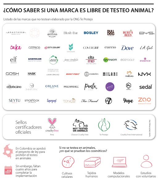 En el listado de Colombia de la organización internacional Peta aparecen en estos momentos algunas marcas que se pueden encontrar en el país como Biogar, Butter London, BYS Cosmetics, Laura Sánchez Makeup, Matricaria, Moira Cosmetics, Natura, O Boticário, Paula by Pautips, Pure Chemistry, Republic Nail, Seytú Cosmética, The Cream Lab, o Vivri, entre otras.