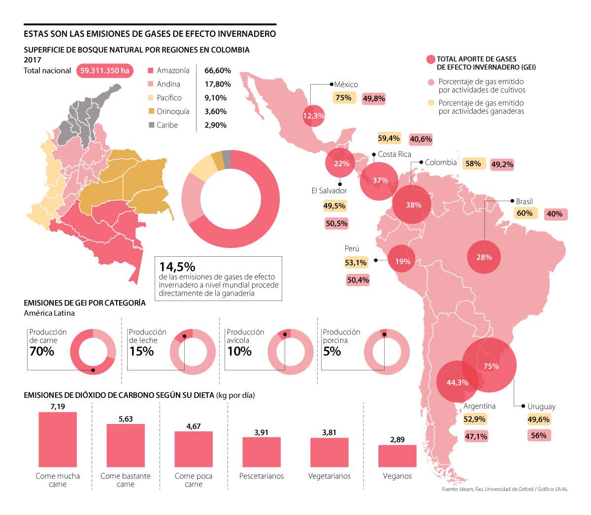 El Instituto de Hidrología, Meteorología y Estudios Ambientales (Ideam) indicó que si bien el inventario nacional de gases de efecto invernadero de Colombia no discrimina las emisiones GEI generadas por la industria cárnica, sí cuenta con una desagregación asociada a los diferentes grupos de animales por vocación ganadera. De acuerdo con el último inventario nacional de gases de efecto invernadero, fueron calculados un total de 22,8 mega toneladas de CO2 equivalente por parte de la ganadería. Estas emisiones corresponden al total de la fermentación entérica y las emisiones por la gestión del estiércol de las especies pecuarias. “Hay que adelantar acciones para que la ganadería contamine menos. Se podría trabajar en la forma en la que se alimenta el ganado, utilizar elementos naturales es un punto absolutamente definitivo. El consumo de energía en todo el sector y la cadena de suministro también debe ser analizado”, manifestó María del Pilar García, directora del Departamento de Derecho de Medio Ambiente de la Universidad Externado.
