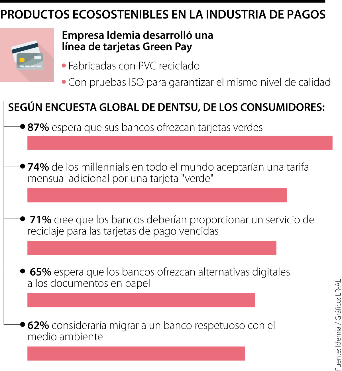 Y es que según una encuesta global que realizó la firma Dentsu, 87% de los consumidores espera que sus bancos ofrezcan tarjetas verdes, mientras que 62% incluso consideraría cambiarse a un banco que sea respetuoso con el medio ambiente.