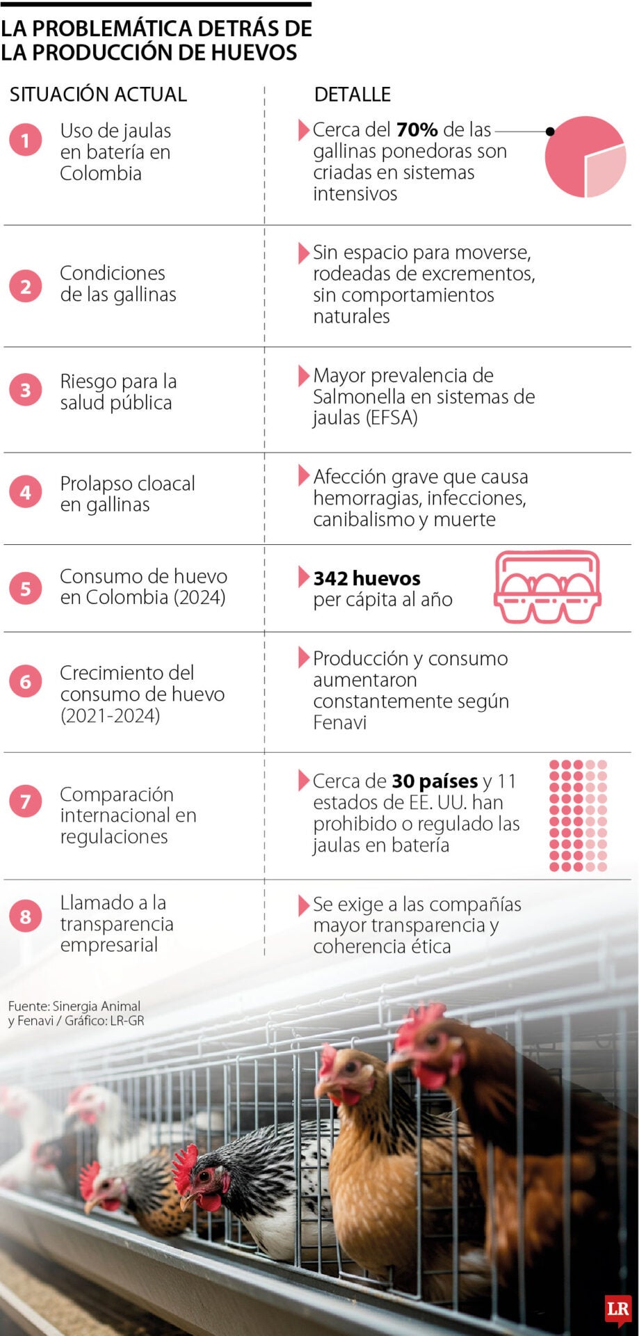 De hecho, en Colombia, cerca de 70% de las gallinas ponedoras son criadas en sistemas realmente intensivos, según lo expone Sinergia Animal, donde no tienen mayor posibilidad de moverse, están rodeadas de excrementos y privadas de cualquier tipo de comportamiento natural que pudiesen tener. Práctica que no solo genera un gran sufrimiento físico y emocional en los animales, ya que, aunque no se crea, también representa una amenaza para la salud pública.