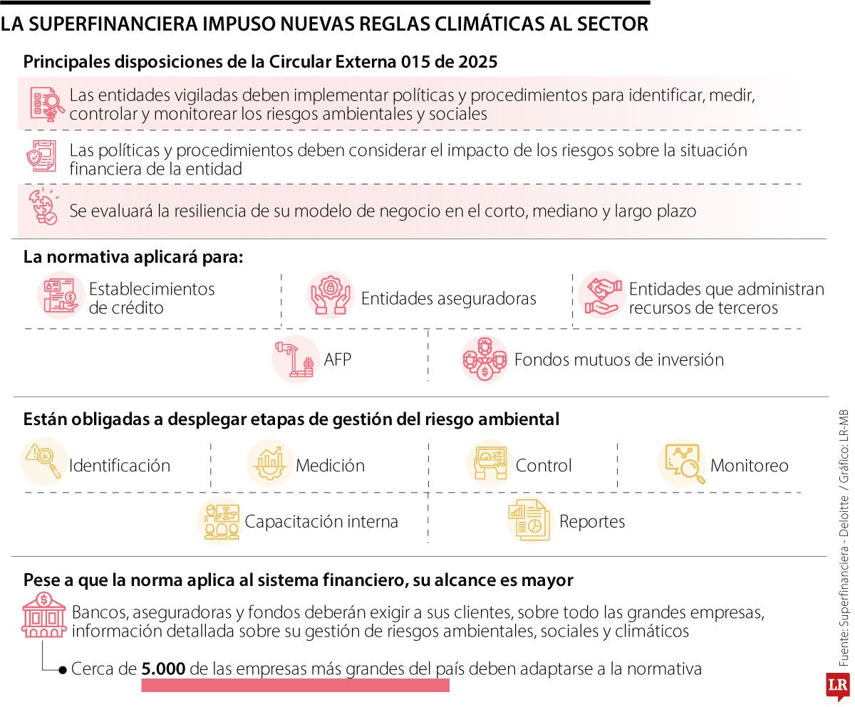 La Superfinanciera expidió la Circular Externa 015 de 2025, normativa que cambia las reglas de juego para el sector. La norma estipula que las entidades vigiladas por el organismo deben implementar nuevas políticas y procedimientos para identificar, medir, controlar y monitorear los riesgos ambientales y sociales, incluidos los climáticos. La norma aplica para bancos, fiduciarias, aseguradoras, AFP y, en general, para todos los actores del sistema.