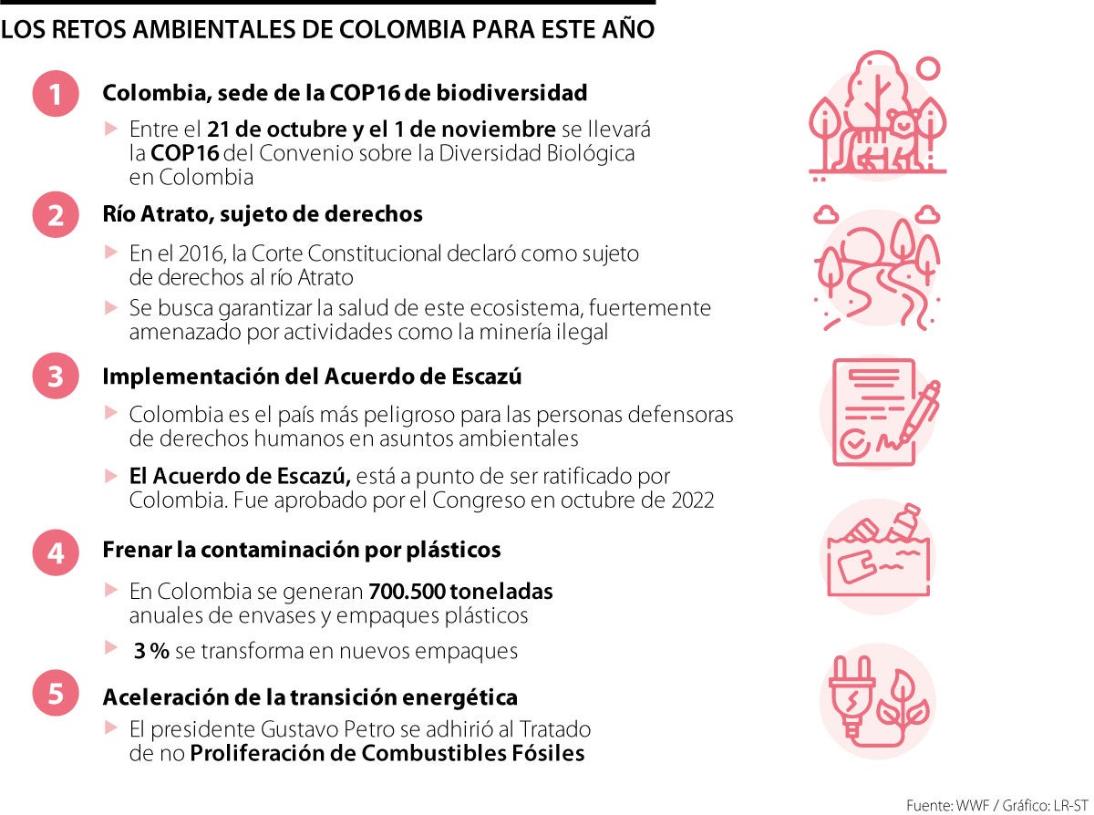 Entre ellos está la implementación del Acuerdo de Escazú, avanzar en la implementación de sentencia de la Corte Constitucional, que declaró como sujeto de derechos al río Atrato, y acelerar la transición energética.