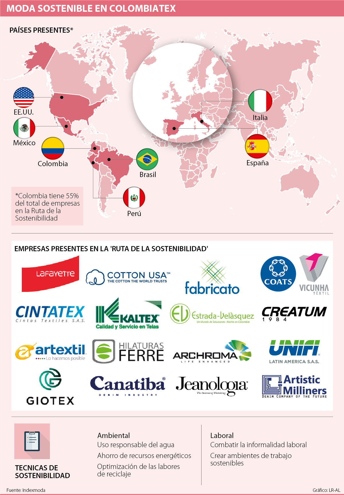 Para 2019, fueron elegidas 17 empresas para conformar el espacio que destinó Inexmoda, organizadora de la feria. A pesar de que 55% del portafolio de empresas sostenibles proviene de Colombia, la firma destacó la presencia de países como Brasil, México, Italia, México, España y Estados Unidos.