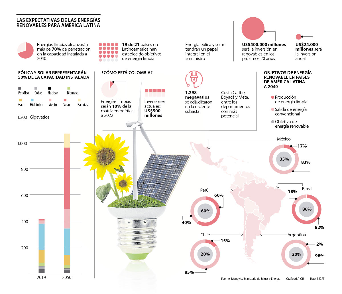 El informe añade que para toda la transformación energética se dará una inversión de un poco más de US$400.000 millones a 2040. Este dinero sería invertido por los países latinoamericanos con el fin de que anualmente se alcance una inversión de US$24.000 millones.