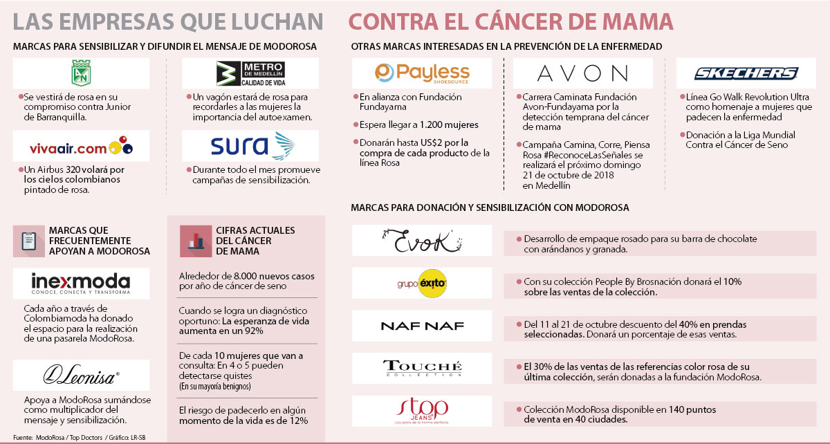 Lina Hinestroza, sostuvo que la iniciativa empieza con un producto, un servicio y una persona. “Todo y todos podemos ser un canal de vida y llegar con información oportuna para que alguna mujer llegue a tiempo”. Otras empresas que también aportan a la Fundación ModoRosa fueron: Evok, Naf Naf, Joyería Intercontinental, VivaAir, Seguros Sura, Leonisa, Mercedes Campuzano, entre otras. Así mismo, a la Fundación Fundayama se sumaron Avon, Grupo Nutresa, Audifarma, y la Alcaldía de Medellín, según explicó su directora y fundadora Claudia Urrego.