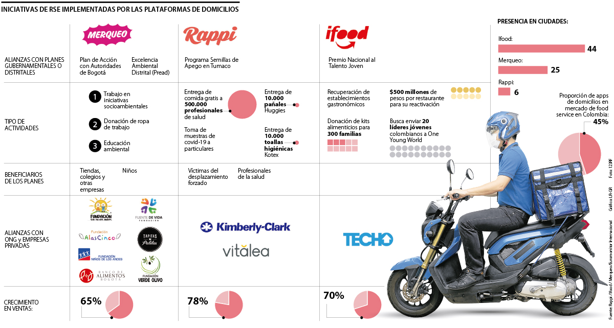 Las aplicaciones de domicilios como Ifood, Domicilios.com, Rappi y Merqueo le apuestan a mitigar el impacto de la crisis económica generada por el covid-19 y el Paro Nacional. Han hecho alianzas para garantizar la recuperación de establecimientos gastronómicos, entrega de comida gratis para profesionales de la salud, toma de muestras de covid-19 a particulares e, incluso, otras más tradicionales, como la donación de pañales y toallas higiénicas, además del trabajo en iniciativas socioambientales.
