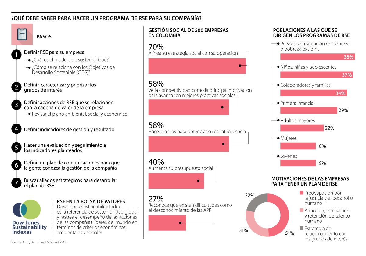 Según la encuesta Panorama de la gestión social de 500 empresas en Colombia, realizada por la Asociación Nacional de Empresarios (Andi), 51% de las compañías que desarrolla programas de RSE lo hace porque tienen una preocupación por la justicia y el desarrollo humano; 31% cree que estas iniciativas le ayudarán a atraer, motivar y retener el talento humano, y 22% considera que es una estrategia de relacionamiento con los grupos de interés.