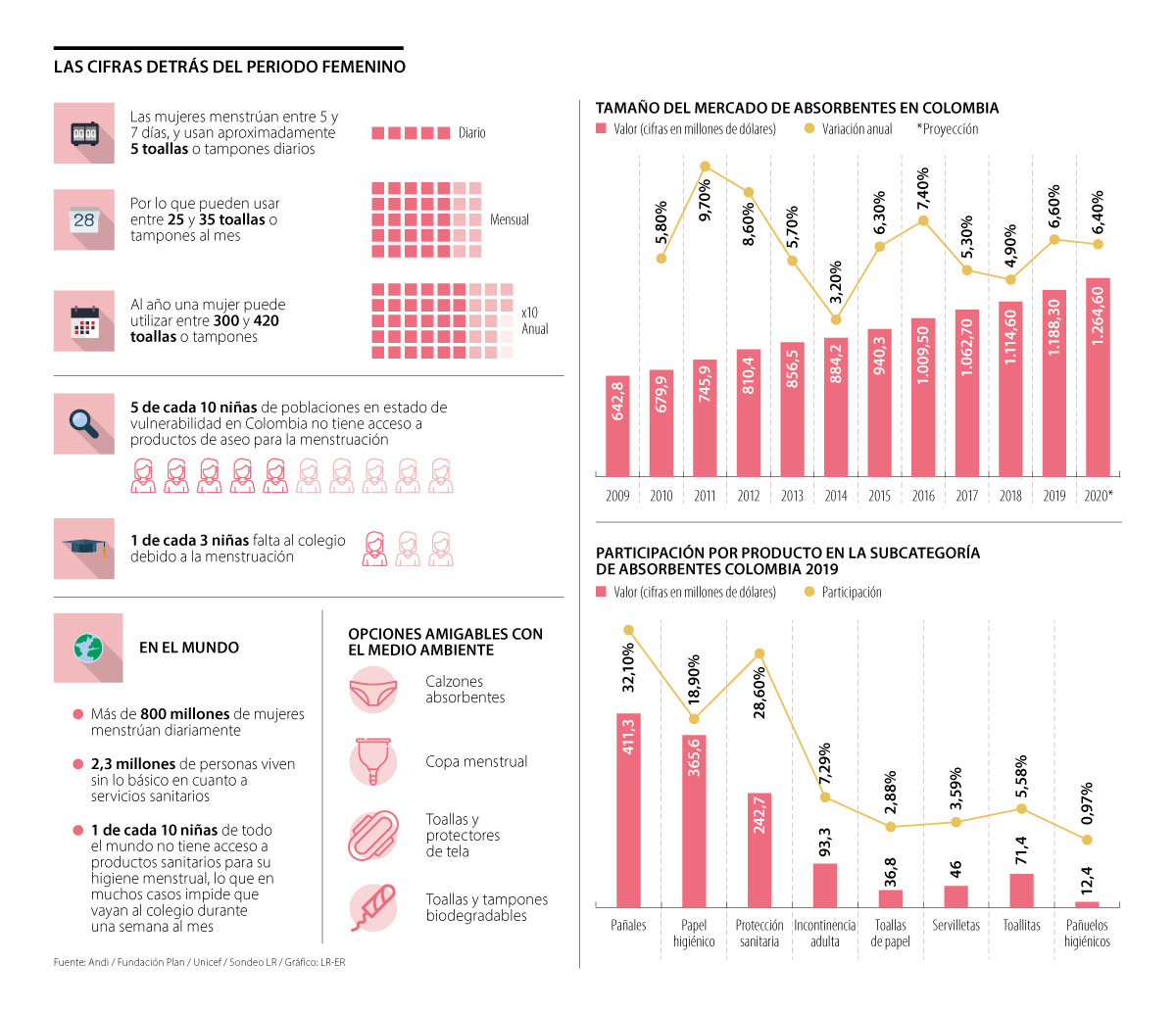 Cifras de Unicef muestran que en el mundo 800 millones de mujeres menstrúan diariamente; la duración del periodo puede ser de cinco a siete días y cada una puede llegar a usar hasta cinco toallas o tampones diarios, lo que significan entre 25 y 35 toallas o tampones al mes, en el año la cifra puede aumentar a 420 por persona menstruante.