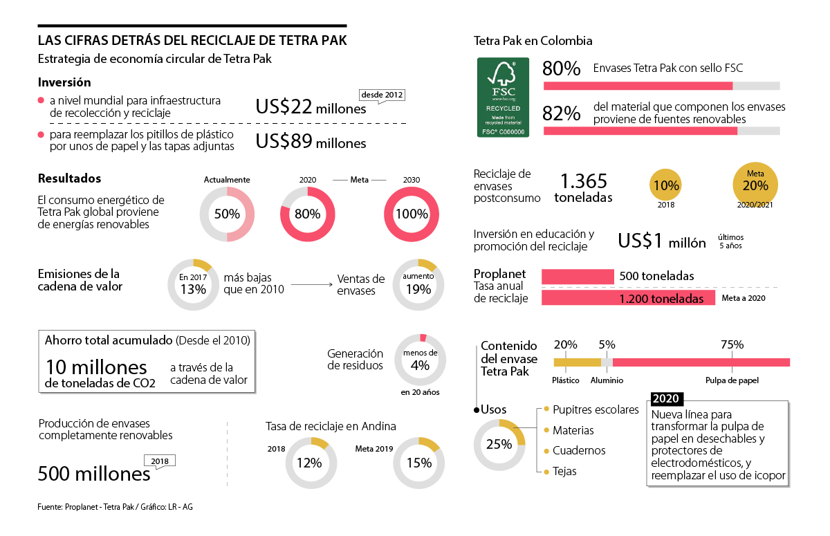 Proplanet es una de las compañías recicladoras que apoyan el proceso de aprovechamiento de los envases Tetra Pak, logrando reciclar cerca de 500 toneladas anuales y con una meta de llegar a las de 1.200 toneladas para cierre de 2020, según lo afirmó Santiago Cáceres, gerente de Proplanet, quien agregó que han podido transformar cerca de 4.000 toneladas de desechos Tetra Pak.