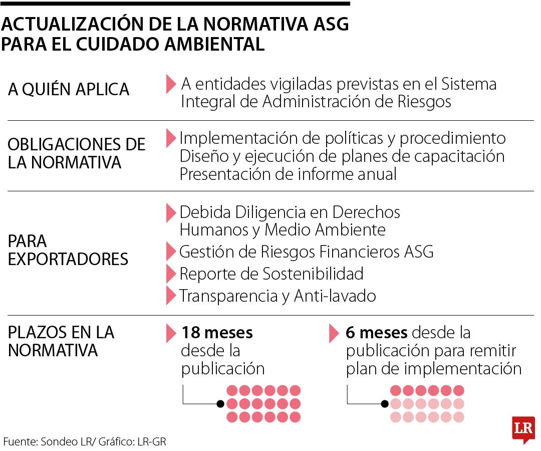 Dentro de las obligaciones del documento está contemplada la implementación de políticas y procedimientos con el propósito de identificar, medir y controlar los riesgos ambientales y sociales. Por otro lado, también se contempló el diseño y la ejecución de planes de capacitación sobre riesgos dirigidos a los funcionarios encargados de gestión de riesgos, la alta gerencia y los miembros de la junta directiva. Otra de las obligaciones es la presentación de un informe anual a la Junta Directiva y Alta Gerencia que contenga identificación de territorios y sectores económicos más expuestos a los riesgos.