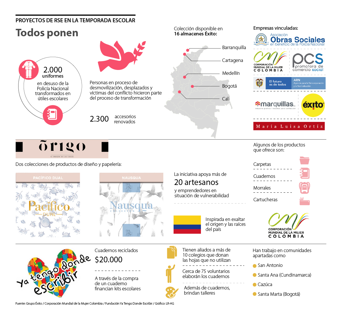 Por ejemplo, el Grupo Éxito en alianza con la Asociación de Obras Sociales en Beneficio de la Policía Nacional, la Corporación Mundial de la Mujer Colombia, la Agencia para la Reincorporación y la Normalización, Marquillas S.A., la Promotora de Comercio Social y junto a la diseñadora colombiana María Luisa Ortiz, lanzaron la colección de útiles escolares realizados a partir de aproximadamente 2.000 uniformes en desuso de la Policía Nacional.