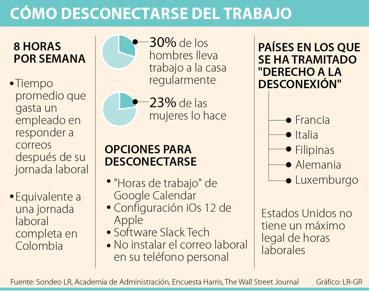 Según un estudio realizado por la Academia de Administración de Estados Unidos, los empleados contabilizan un promedio de ocho horas a la semana en las que responden a correos electrónicos relacionados con el trabajo después de salir de la oficina; cifra que es equivalente a casi una jornada laboral adicional en Colombia, teniendo en cuenta que desde 2017 esta aumentó de ocho a 10 horas.