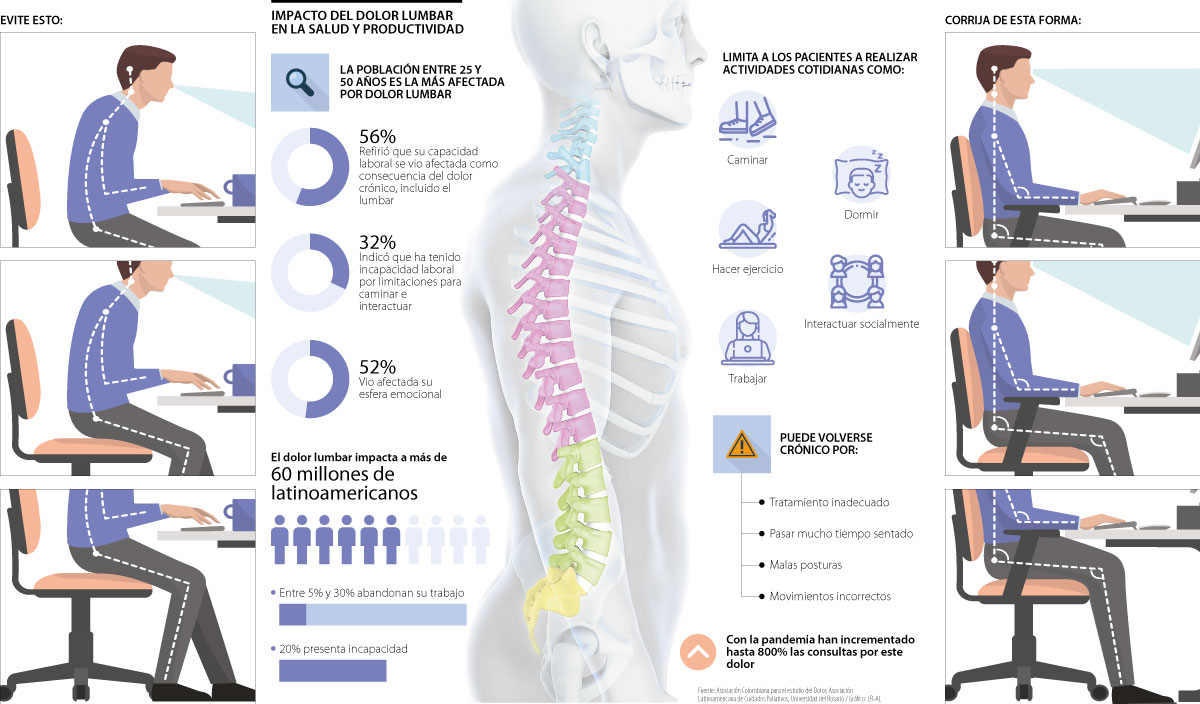 A esto se suma que, según una encuesta realizada por la Asociación Colombiana para el estudio del Dolor, 56 % de las personas consultadas aseguró que su capacidad y productividad laboral se vio afectada de manera muy importante o moderadamente, como consecuencia del dolor crónico, incluido el lumbar.