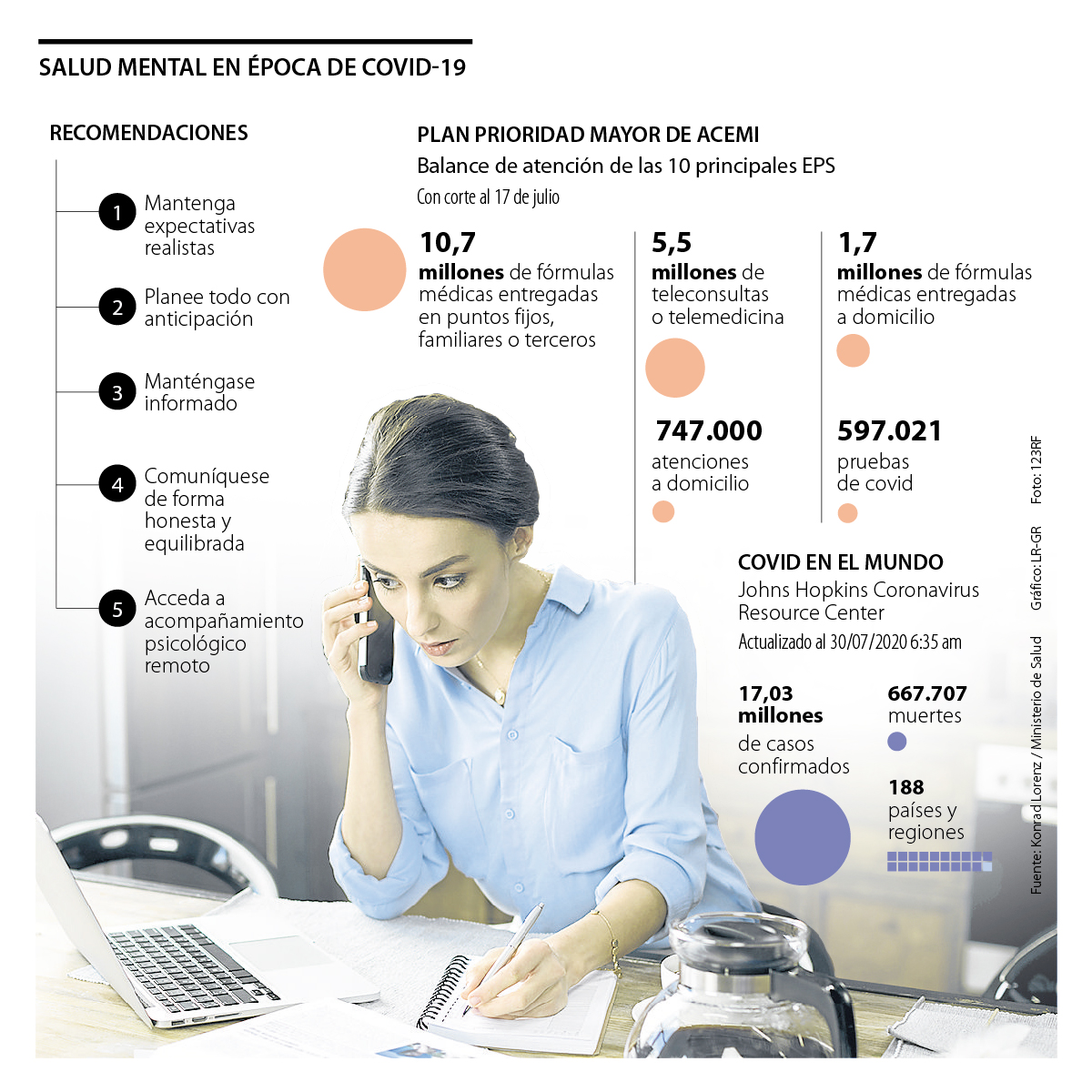 Finalmente, el acompañamiento psicológico remoto es una alternativa que no debe dejar de lado. Ya sea por vía telefónica o mediante videollamada, es importante que cuente con el acompañamiento de un profesional, un servicio al que puede acceder a través de su EPS o por la línea 192 (opción 4) que habilitó el Ministerio de Salud para las personas que necesiten apoyo.