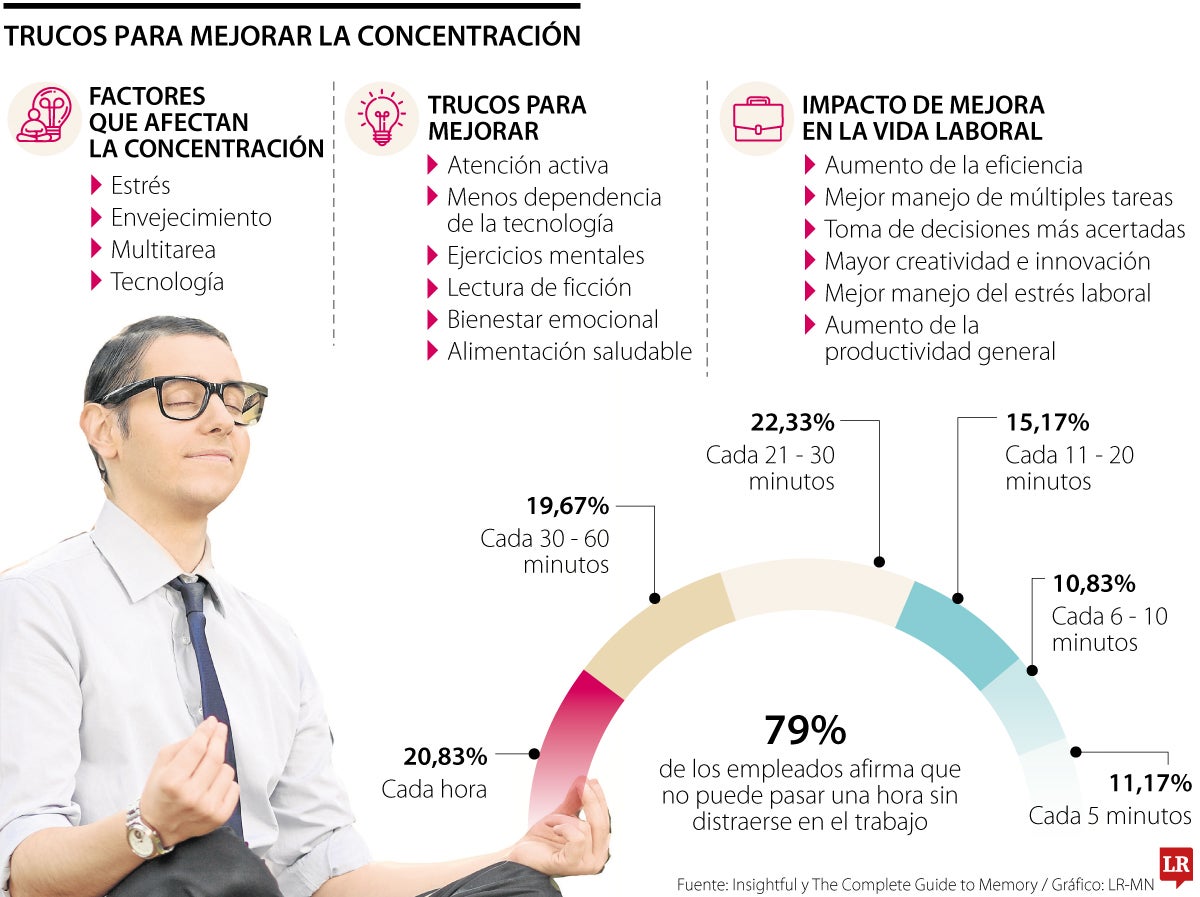 Según un informe de Insightful de 2024, 79% de los empleados encuestados no puede pasar una hora sin distraerse en el trabajo. Además, el estudio muestra que 20,83% de los empleados se distrae cada hora, mientras que 19,67% lo hace entre 30 y 60 minutos. Otros datos revelan que 22,33% pierde la atención cada 21-30 minutos, 15,17% cada 11-20 minutos, 10,83% cada 6-10 minutos y 11,17% incluso cada 5 minutos.
