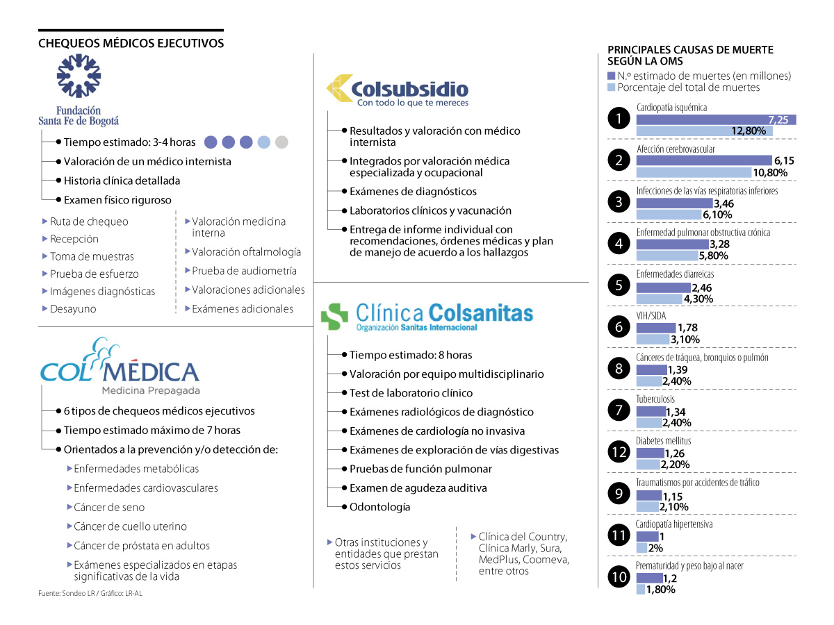La Fundación Santa Fe de Bogotá es una de las clínicas que trabajan chequeos ejecutivos. La institución ofrece valoración en un tiempo promedio de tres a cuatro horas por medio de un médico internista, quien hace una historia clínica detallada y un examen físico riguroso.