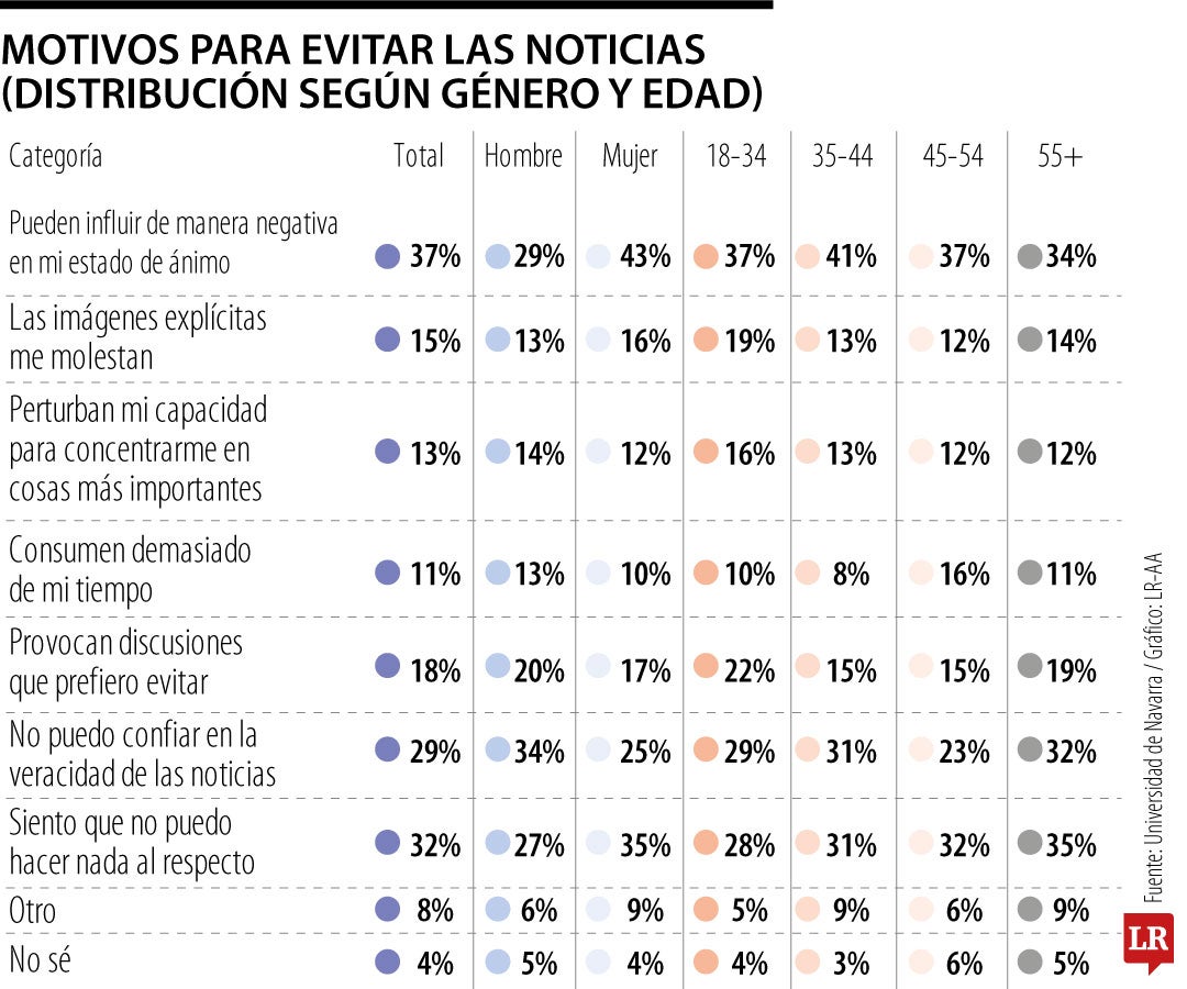 Un estudio de la Universidad de Navarra reveló los principales motivos por los cuales las personas evitan el contenido de noticias. Entre las razones para evitar las noticias están que pueden influir de forma negativa en el estado de ánimo, así como generar molestias por imágenes explícitas.