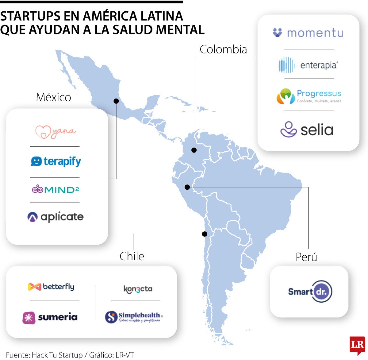 Otras startups de salud mental en la región son Smart en Perú; Betterfly, Sumeria, Simplehealth y Kon3cta en Chile; y Yerbo, Sigmind, Neomente en Argentina.
