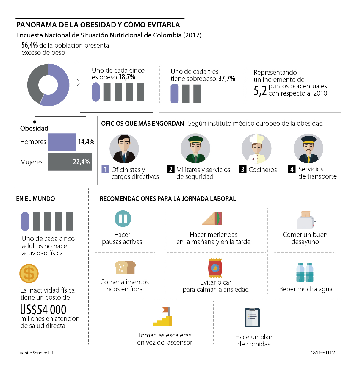 Un colombiano trabaja en promedio 2.193 horas al año (44,6 horas por semana), por lo que la mayor parte de su tiempo estará frente a un computador, sentado y con poca actividad física, lo que facilita el aumento de peso. Si bien algunas profesiones implican mayor dificultad que otras para poder llevar un estilo de vida saludable, debido a las condiciones laborales, siempre se debe hacer un esfuerzo por tener una buena alimentación durante la jornada, y más teniendo en cuenta que de acuerdo con la Encuesta Nacional de Situación Nutricional, 56,4% de la población presenta exceso de peso.
