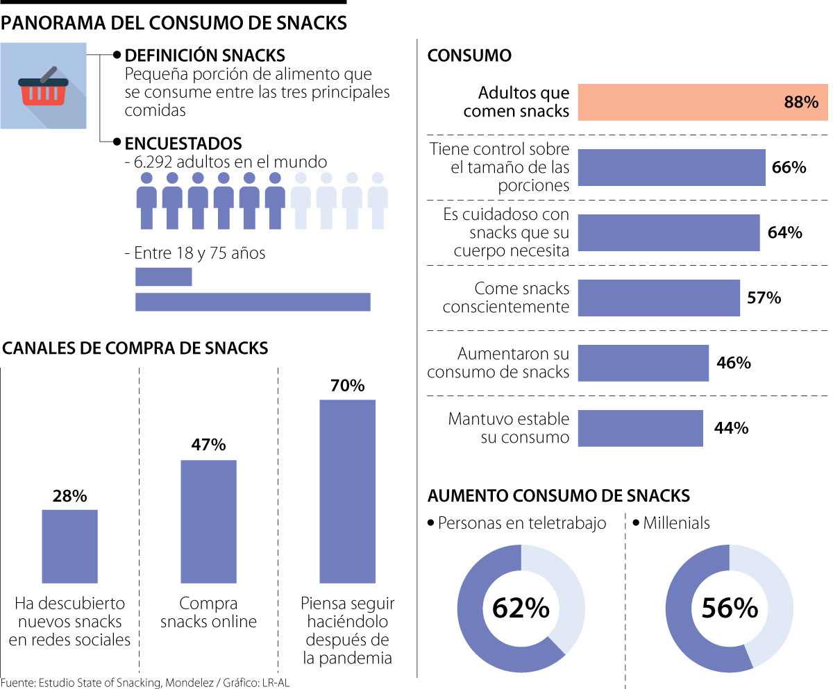 Son varios los estudios que muestran que la pandemia, y las medidas de encierro asociadas a su contención, cambiaron los hábitos de consumo de los ciudadanos en varias esferas de su vida cotidiana. Uno de ellos es el de la alimentación, donde los resultados de la encuesta ‘State of Snacking’, desarrollada por Mondelez International y The Harris Poll, muestran que 46% de los encuestados aumentó su consumo de snacks y que seis de cada 10 personas empezó a consumirlos más por cuenta del trabajo en casa.