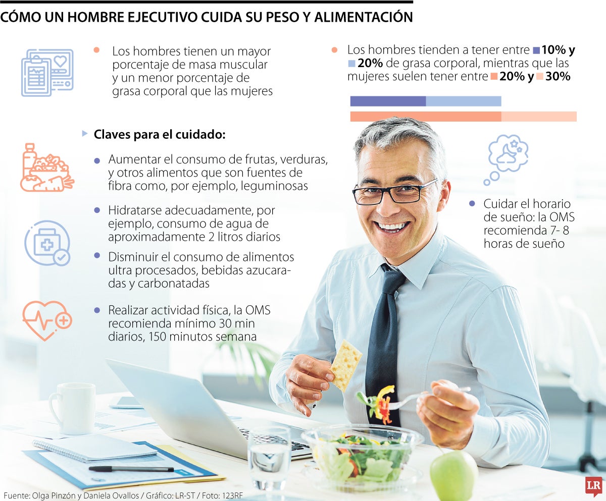 La nutricionista Olga Pinzón, dijo que hay tips básicos que los hombres pueden implementar en el día a día para estar sanos, entre ellos: consumir frutas y verduras que son altos en fibra, además de ingerir dos litros de agua diarios, realizar actividad física y dormir entre siete u ocho horas.