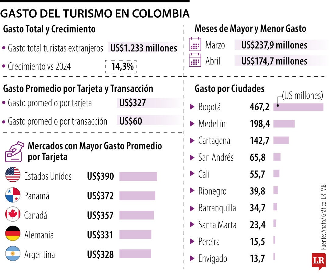 Los turistas estadounidenses y panameños fueron los que más gastaron en promedio. Estados Unidos, con US$390; Panamá, con US$372; Canadá, con US$357; Alemania, con US$331; y Argentina, con US$328