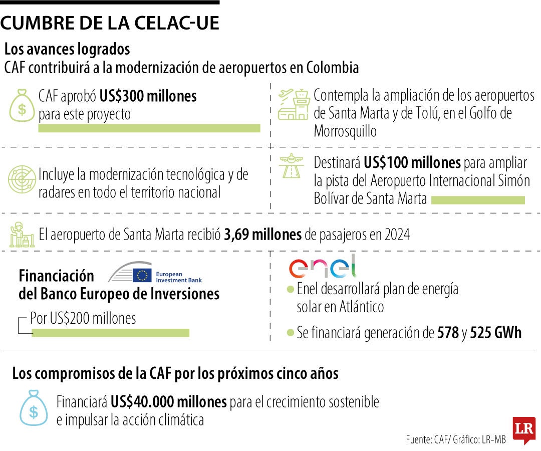 Los compromisos tienen que ver con infraestructura en aeropuertos (por US$300 millones de CAF) y dos proyectos solares (del Banco Europeo de Inversiones)