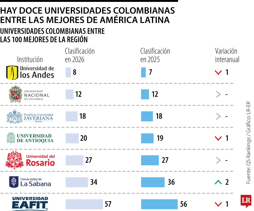 Dentro de las 100 mejores universidades de la región, Colombia cuenta con doce representantes, y empata con Argentina en el cuarto lugar con más instituciones